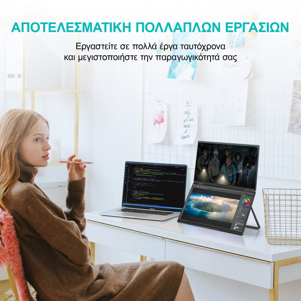 Η οθόνη μπορεί να συνδεθεί μέσω USB-C ή HDMI, με τις δύο οθόνες να προσφέρουν καθαρή και ευκρινή εικόνα σε ανάλυση Full HD (1920 × 1080). Είναι ιδανική τόσο για εργασία όσο και για ψυχαγωγία, επιτρέποντάς σας να εναλλάσσετε μεταξύ εκτεταμένης, κατοπτρικής ή διπλής οθόνης.