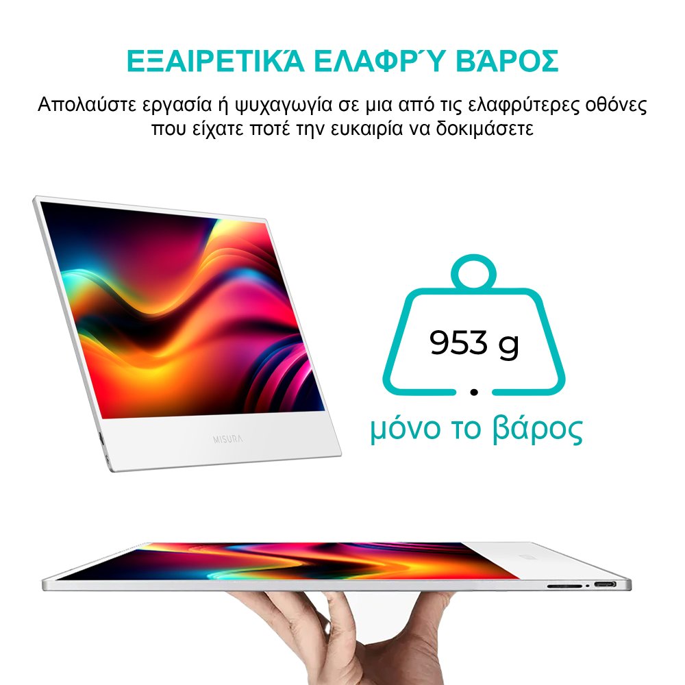 Η οθόνη LED MISURA STYLE -16" διαθέτει χαμηλό βάρος 0,95 kg και εξαιρετικά λεπτό πλάτος 6 mm . Χάρη στο εξαιρετικά λεπτό πλαίσιο, το συνολικό μέγεθος είναι μόλις 24,8cm x 36cm x 0,6cm. Για τη λειτουργία της οθόνης, χρειάζεστε ένα μόνο καλώδιο USB-C, το οποίο αναλαμβάνει τόσο τη μεταφορά εικόνας όσο και τη μεταφορά ενέργειας.
