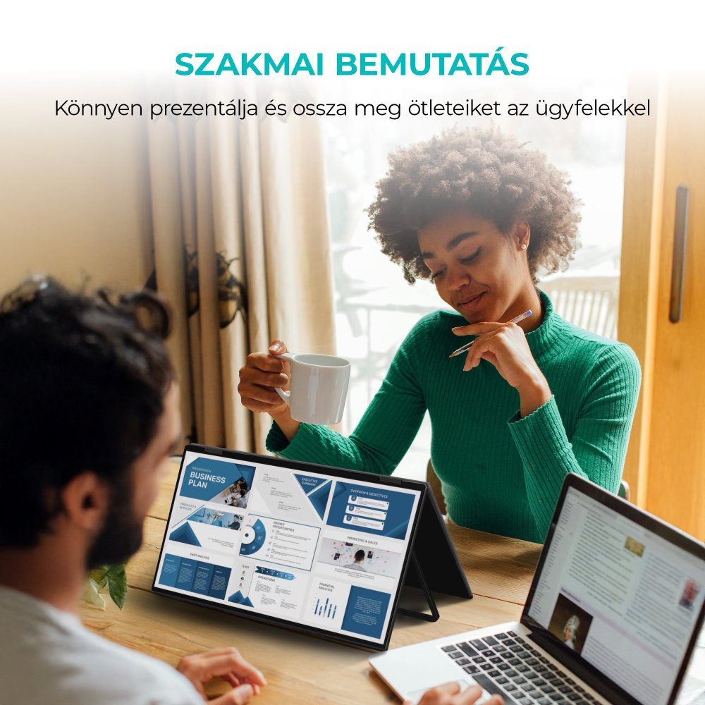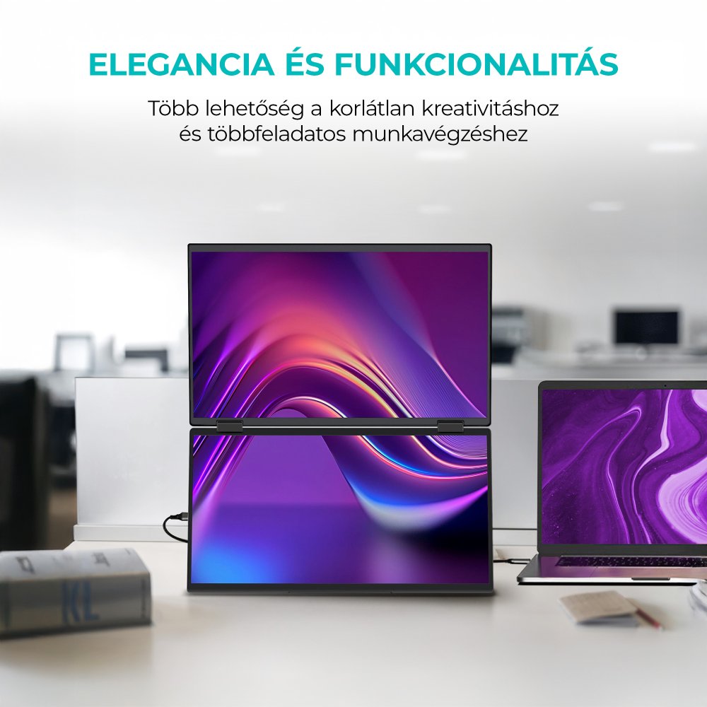 A monitor USB-C vagy HDMI csatlakozón keresztül köthető össze, mindkét képernyő tiszta és éles képet biztosít Full HD felbontásban (1920 × 1080). Ideális munkavégzéshez és szórakozáshoz egyaránt, lehetővé téve a kiterjesztett, duplikált vagy duál képernyős módok közötti váltást.