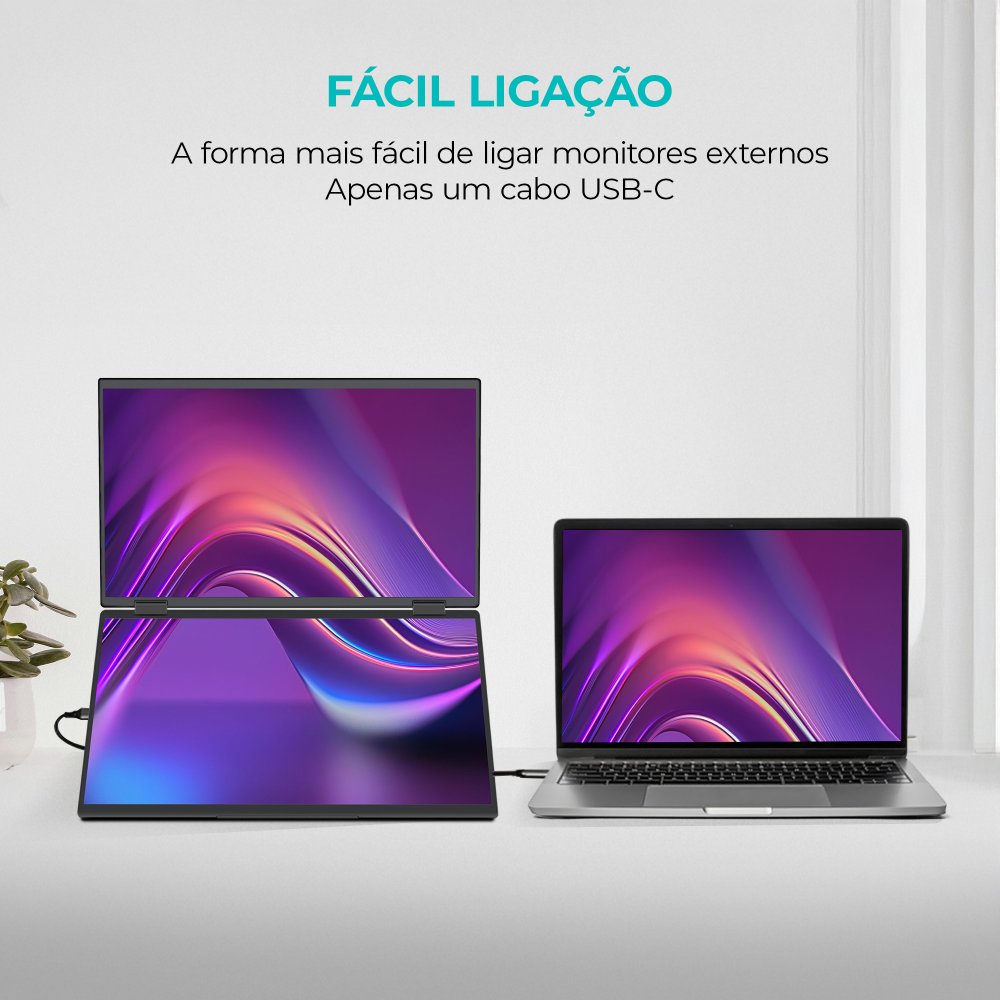 O monitor pode ser conectado via USB-C ou HDMI, com ambas as telas proporcionando uma imagem clara e nítida em resolução Full HD (1920 × 1080). É ideal tanto para trabalho quanto para entretenimento, permitindo alternar entre os modos de ecrã estendido, duplicado ou duplo.